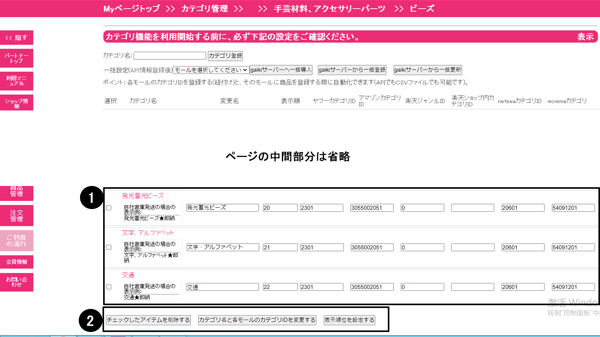 たとえば、ショップ内のカテゴリ「ビーズ」に登録した商品をモールに出品する際に、自動的にモールのカテゴリID(ジャンルID)が登録されます。