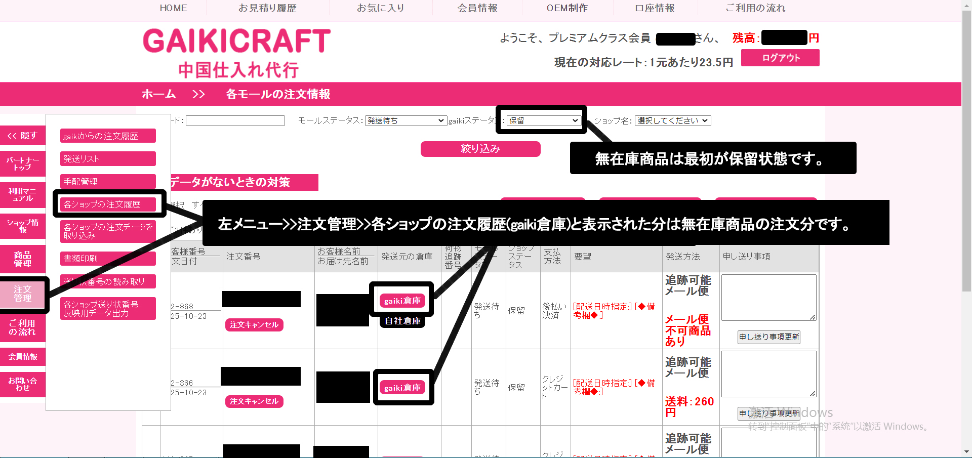 無在庫注文手配の進捗状況 左メリュー>>注文管理>>各ショップの注文履歴