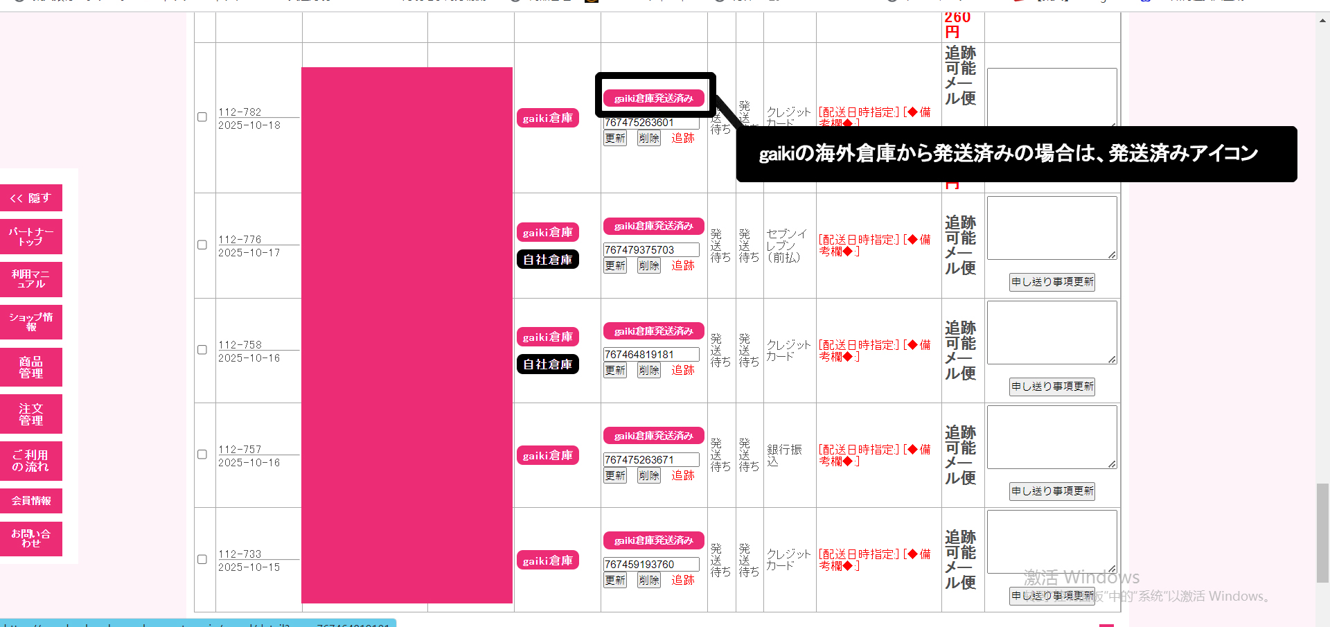 注文状況の確認ページの開き方 左メリュー>>注文管理>>各ショップの注文履歴