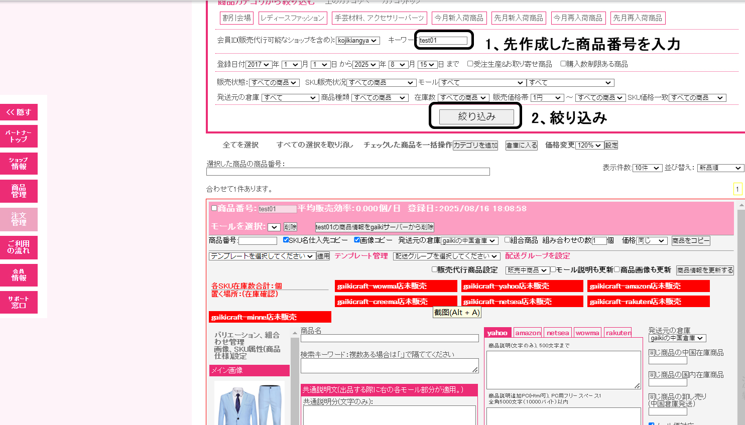 1、左メリュー>>商品管理>>商品管理>> 作成した商品を商品番号で検索