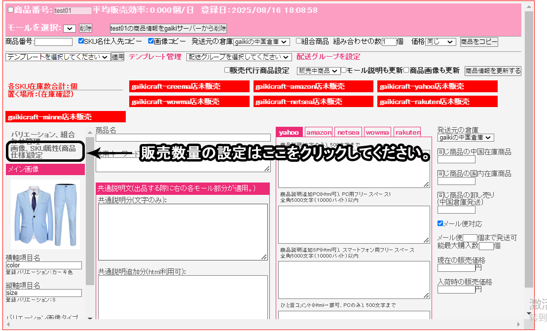 3、商品情報作成後、必ず販売数量を設定してください。(gaikiスタッフがそれを見て数量を確認します。)