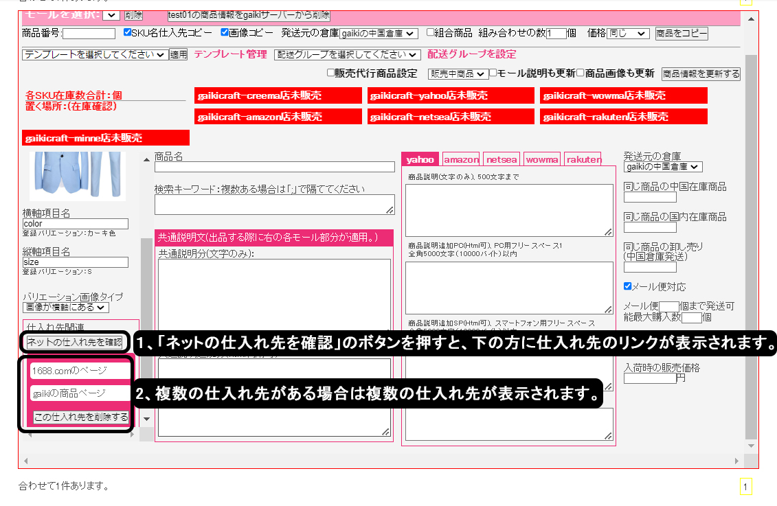 1、無在庫販売の場合は必ず仕入れ代行ページから商品情報を作成してください。