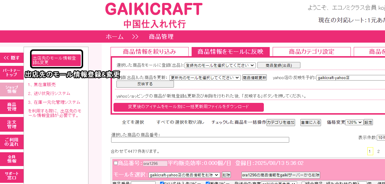 1、左メニューのショップ情報 >> 出店先のモール情報登録&変更