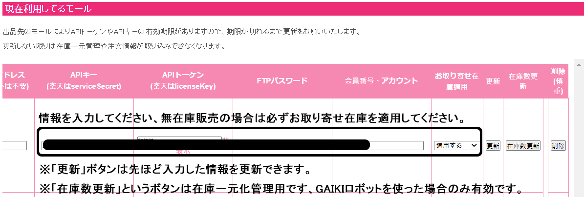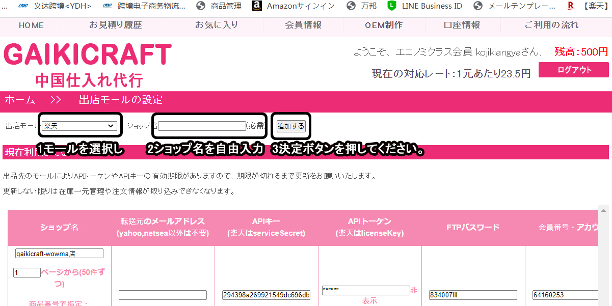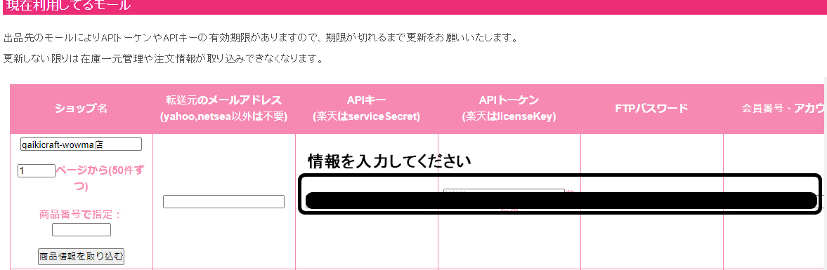 1、rakutenショップは「APIキー」、「APIトーケン」、「会員番号、アカウント」の入力が必要です。