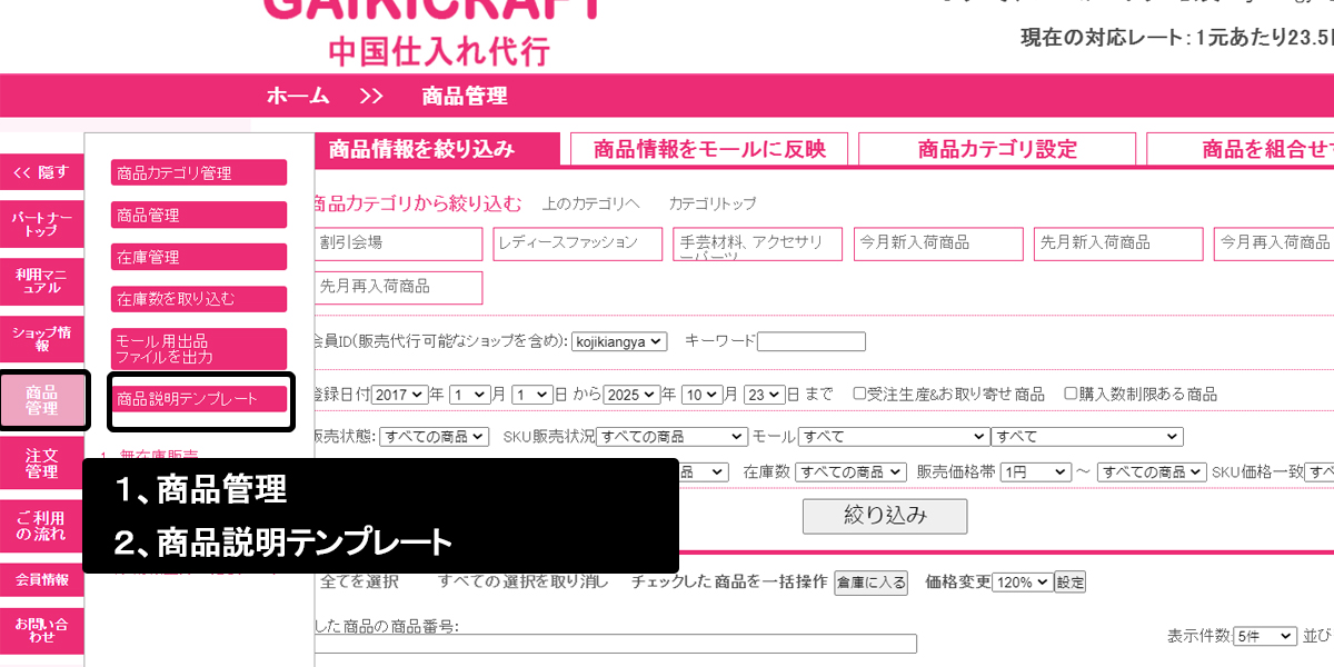 テンプレート編集ページの開き方 左メリュー>>商品管理>>商品説明テンプレート