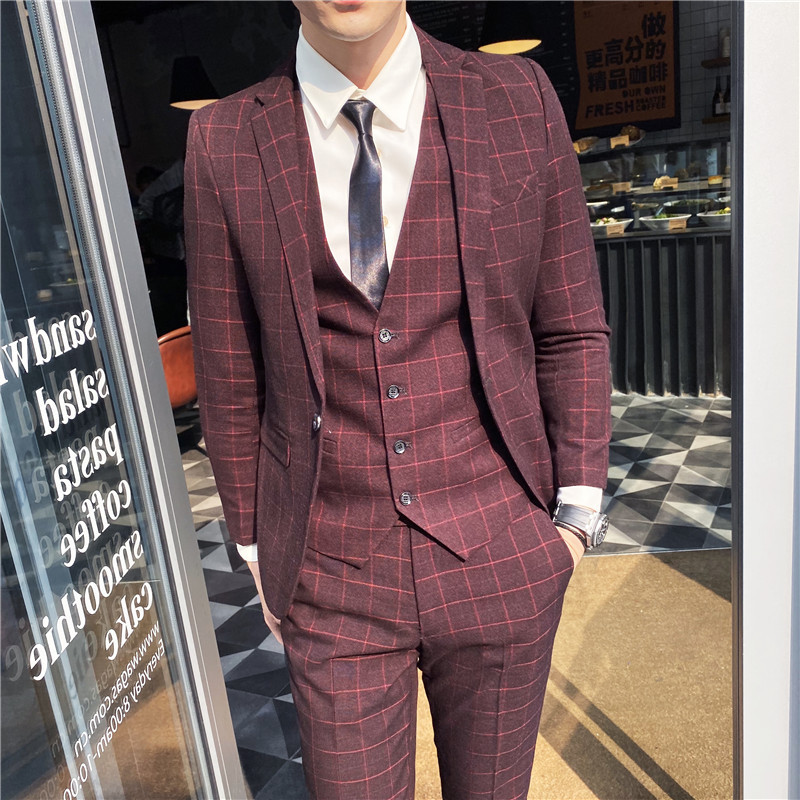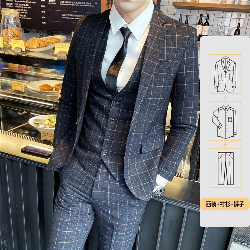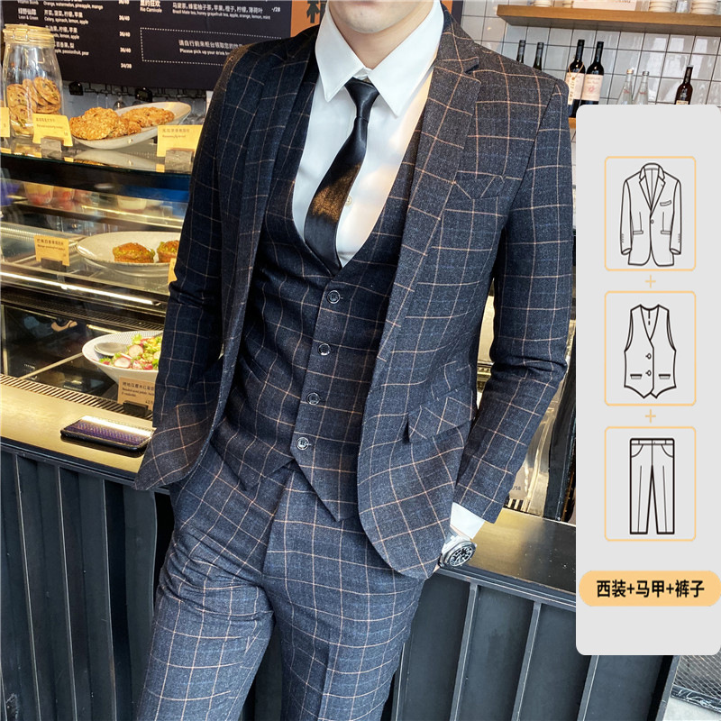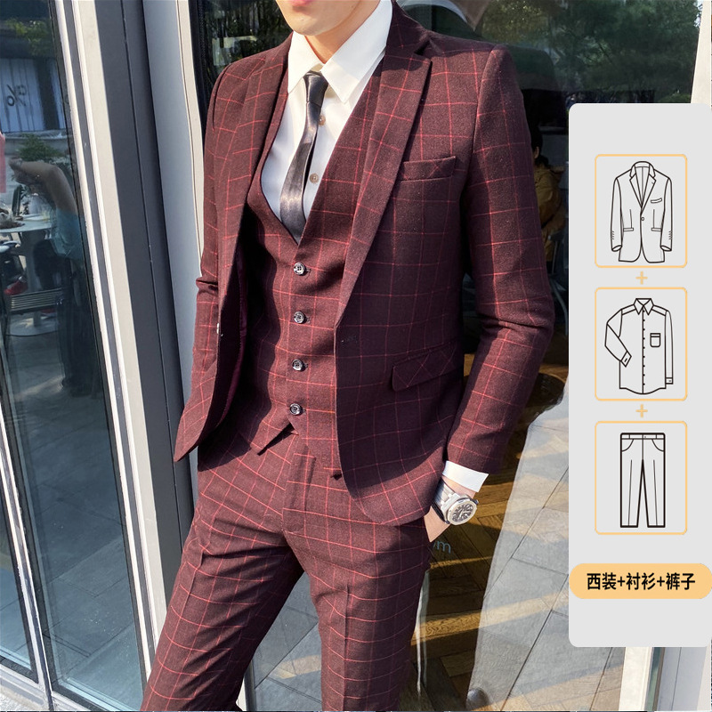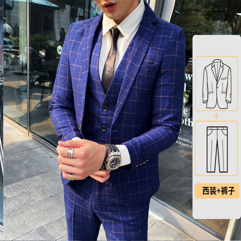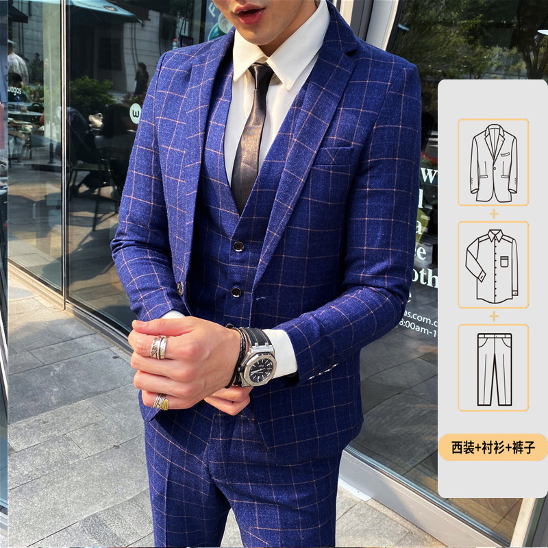 新型スーツセット男性三点セット春秋韓国版修身格子小スーツ新郎伴英倫風ビジネス